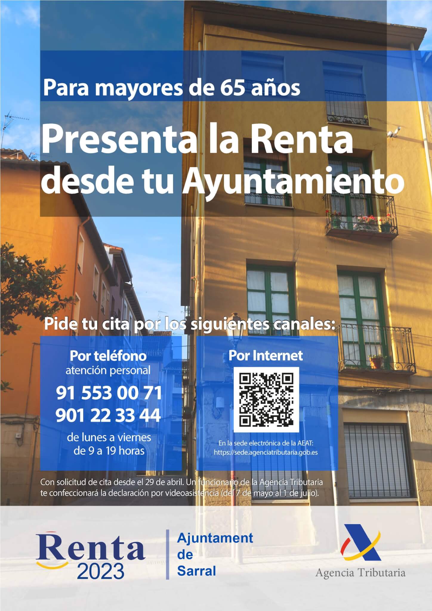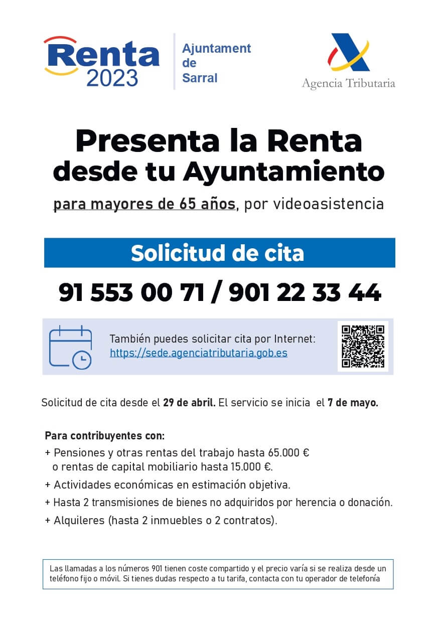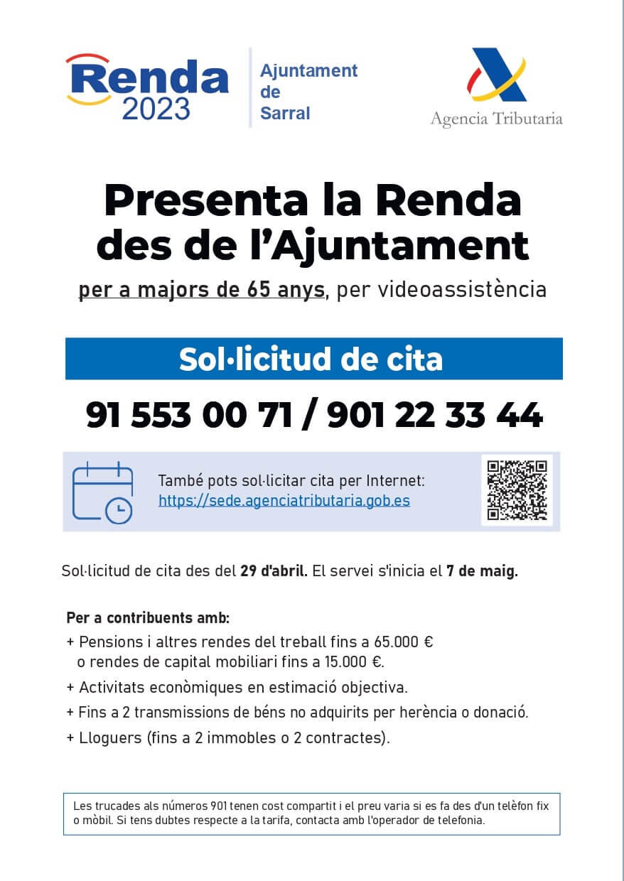 L’Ajuntament de Sarral junt amb l’Agència Tributària ofereix aquest any als majors de 65 anys, la possibilitat de presentar la Renda des de l’Ajuntament. Es poden adherir a aquest servei tothom, major de 65 anys, que estigui empadronat a Sarral, Montbrió de la Marca i Vallverd