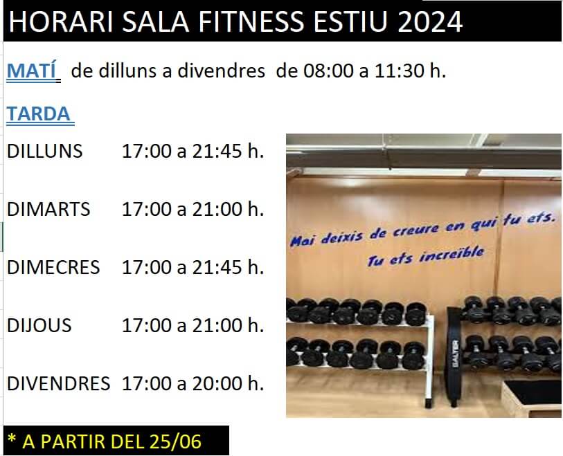 Del 25 de juny al 25 de juliol, al pavelló municipal seguim amb les activitats dirigides. A més, durant el mes d’agost estarà disponible la sala fitness.
