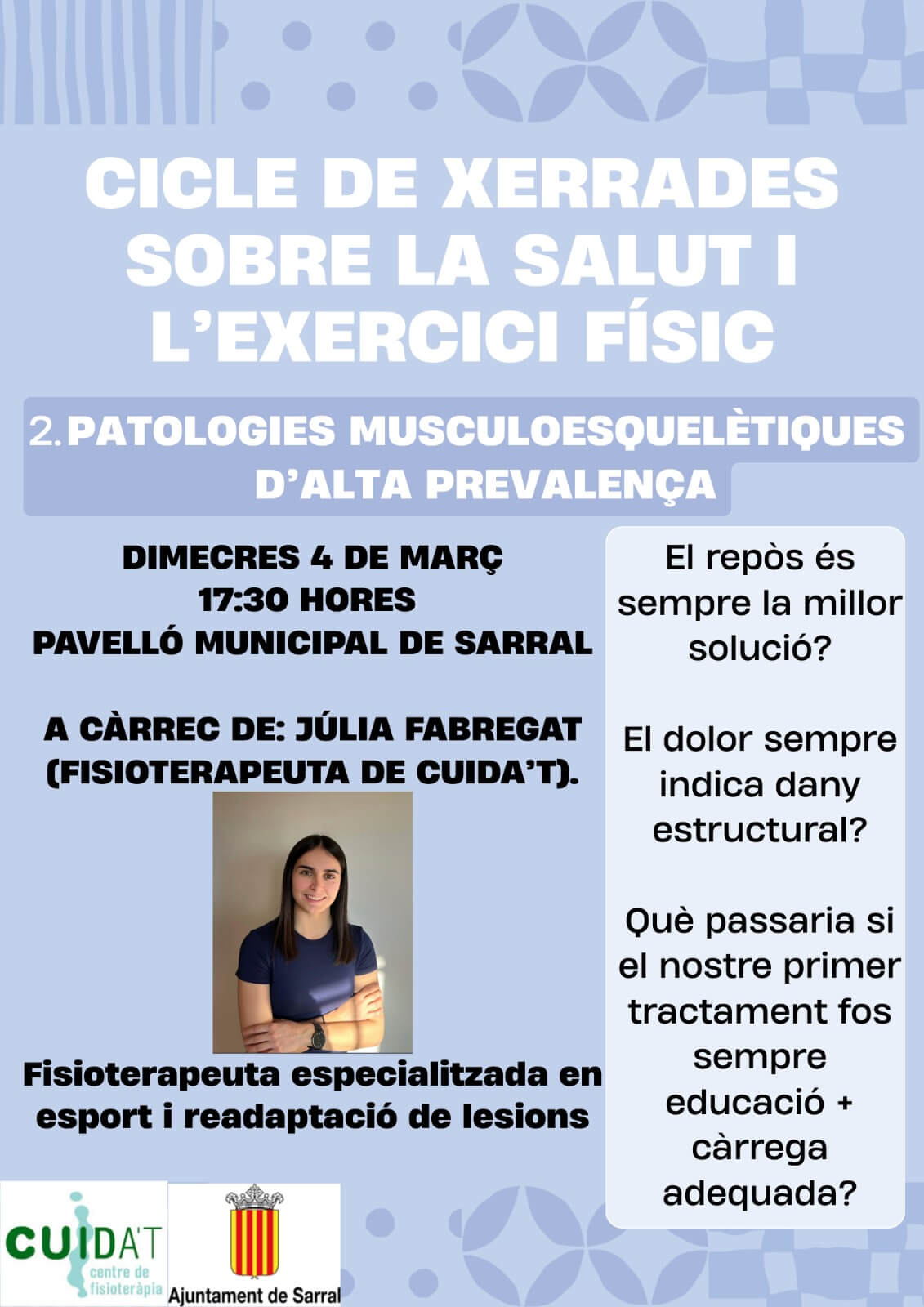 En aquest cas, ens acompanyarà la Júlia Fabregat, fisioterapeuta especialitzada en l’esport i la readaptació de lesions que ens ajudarà a entendre quines són les patologies musculoesquelètiques d’alta prevalença i com les podem afrontar.